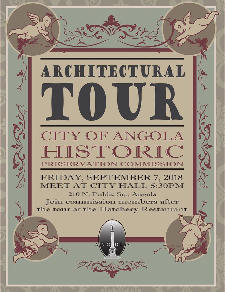Architectural Tour Friday, Sep 7, 2018 5:30pm – 8:00pm Event Location Location Downtown Angola, INAngola Event Fees FREETotal Seats 999Remaining Seats 999Registration is closed for this event.For more information or questions, please email: 46703